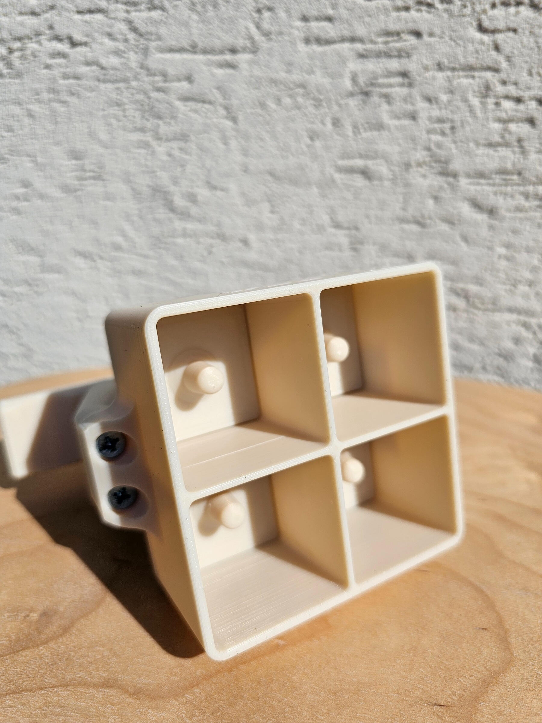 Kockovač je vyrobený technológiou 3D tlače z materiálu ASA, ktorý zaručuje veľmi dobré mechanické vlastnosti, odolnosť voči poveternostným vplyvom ako aj UV žiareniu. Použité kovové komponenty so zinkovou povrchovou úpravou sú prísľubom dlhej životnosti.